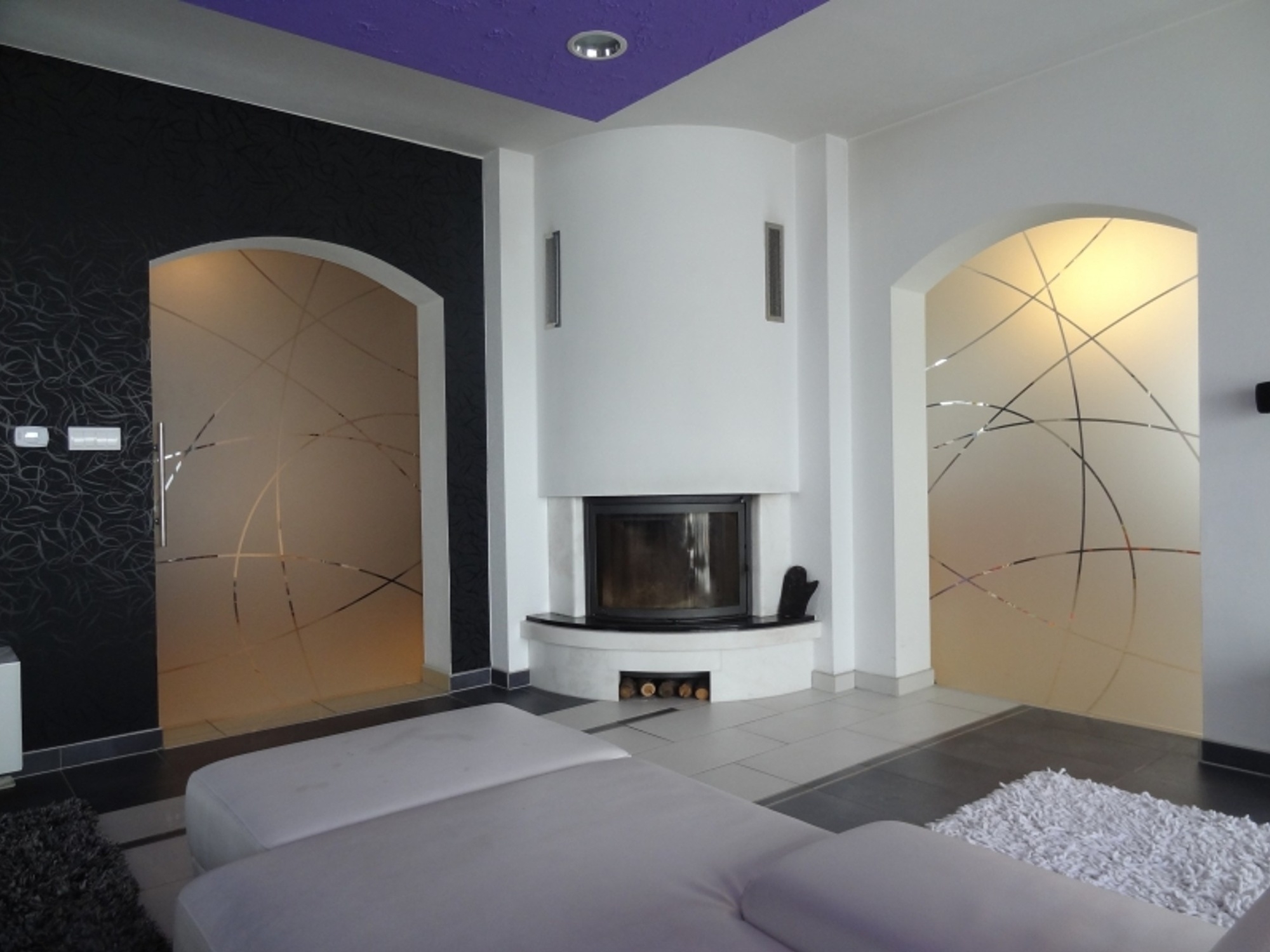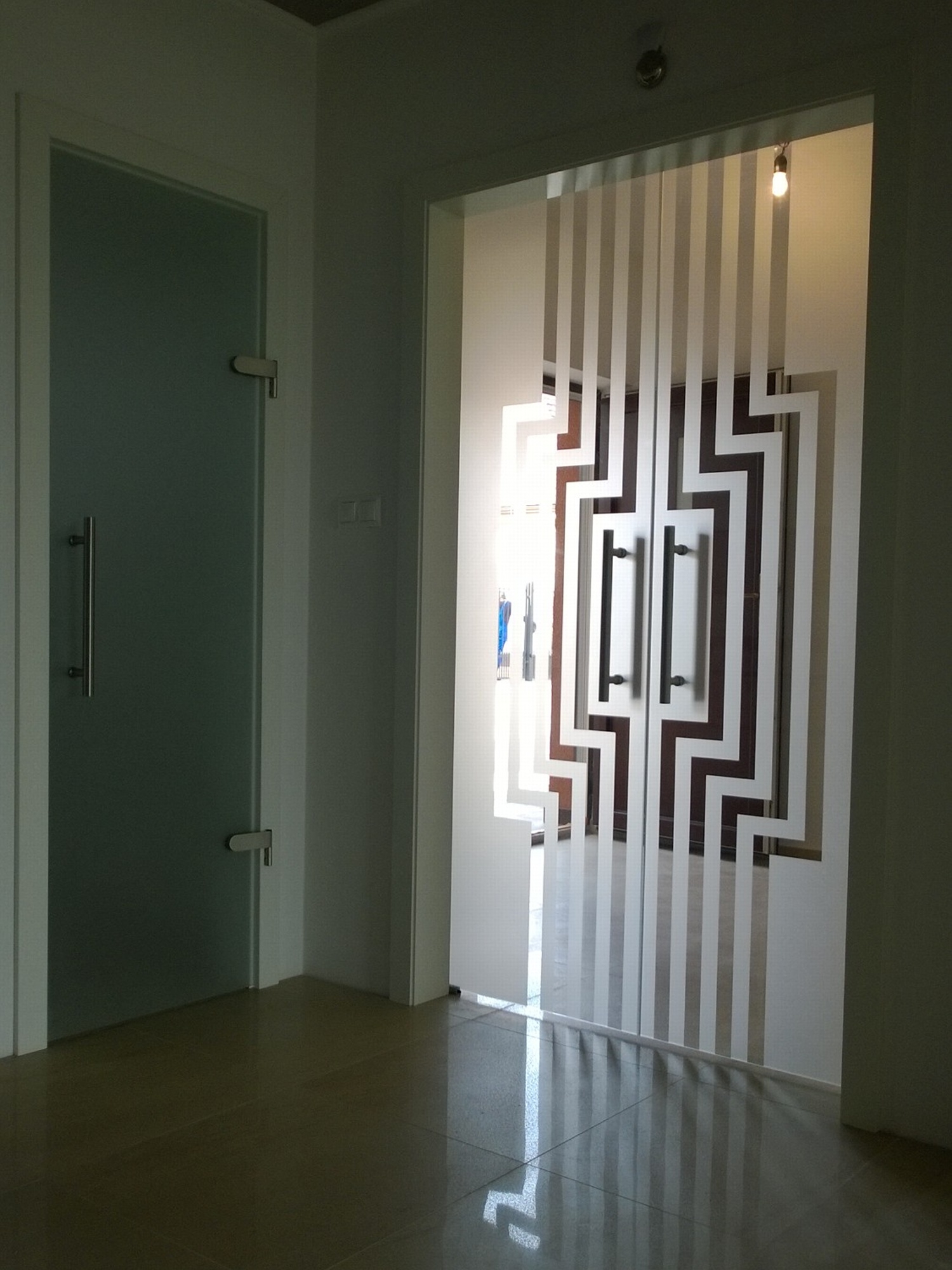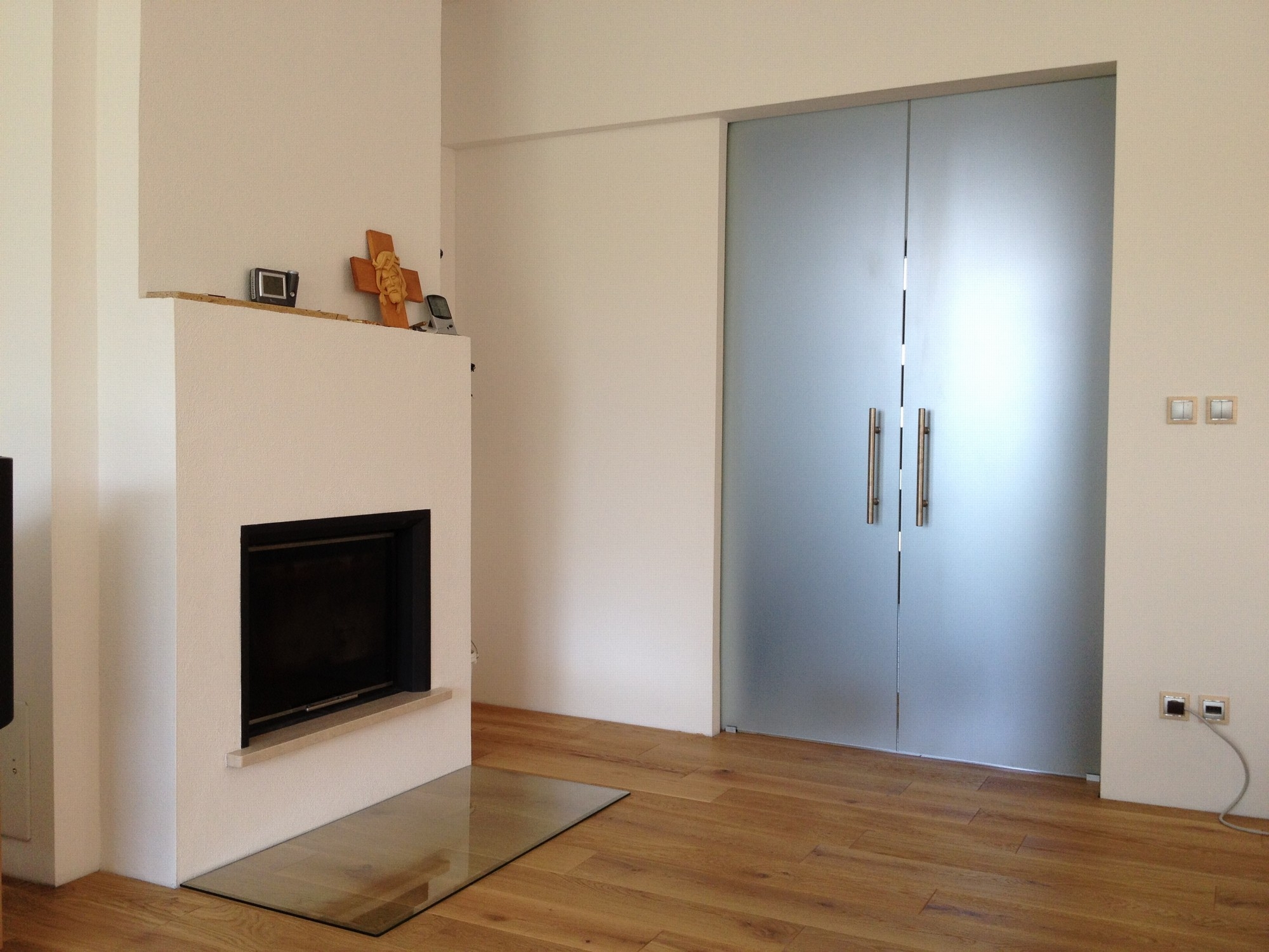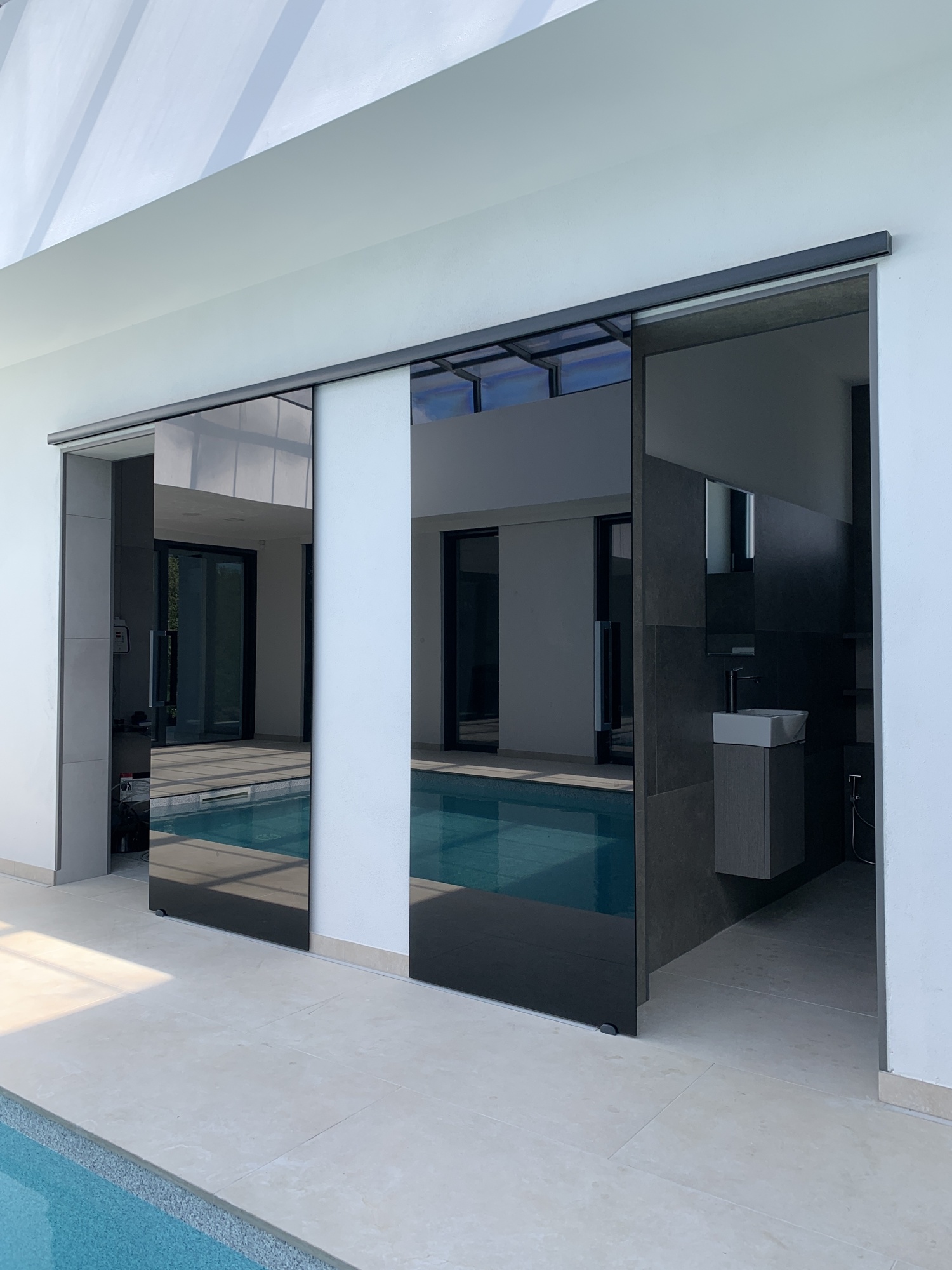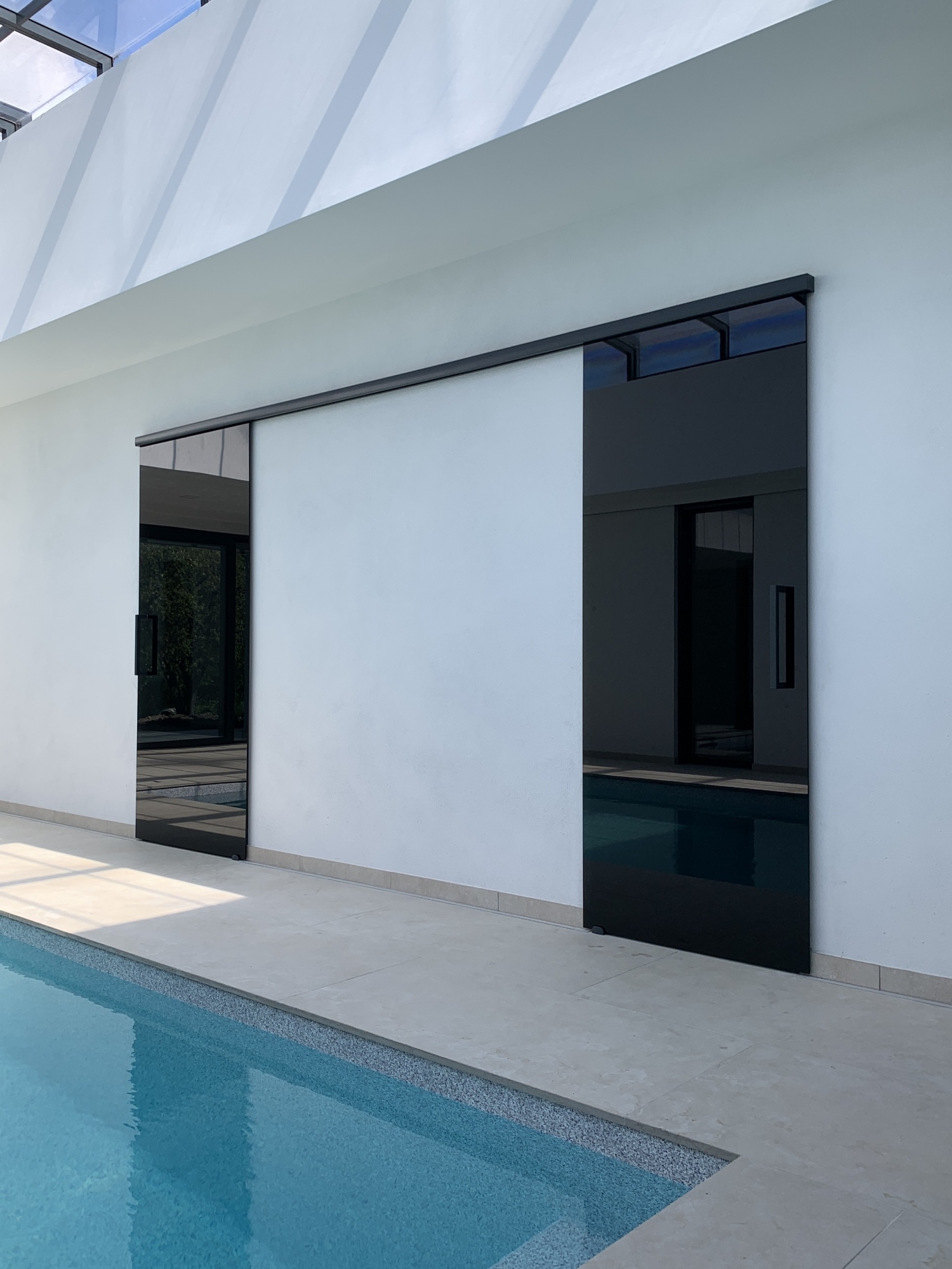 Charakteristika: Pôsobí luxusne a technicky. Často sa označuje ako „Barn door“ štýl v celosklenenom prevedení.