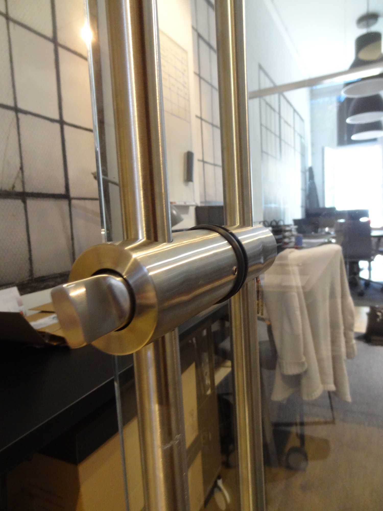 Vzhľad: Sklo je uchytené pomocou masívnych nerezových kotúčov (bodov), ktoré sa pohybujú po nerezovej tyči.